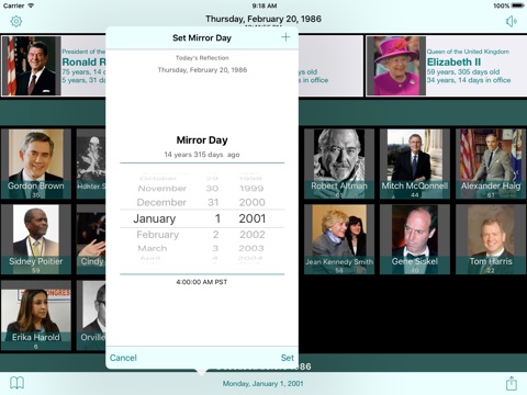 Every day the reflection of today in your Mirror Day moves back another day, and we show you who was in political office, who was alive, who was deceased, and who would be born in the future. The persons are shown in order of the length of their Wikipedia article.