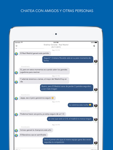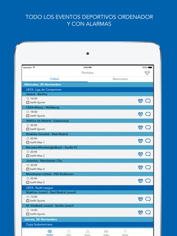 In one app youll be informed about all sport events and also chat during broadcasts. You can set alarms for any sports broadcast for several leagues and competitions.