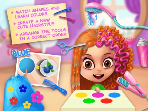 · Hair salon is perfect to learn colors. Create a new hairstyle for Miss Preschool, match shapes and choose the right color hair stylist tools!