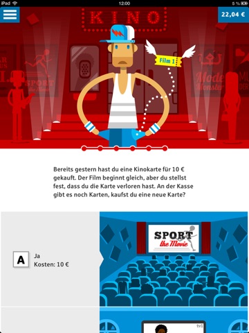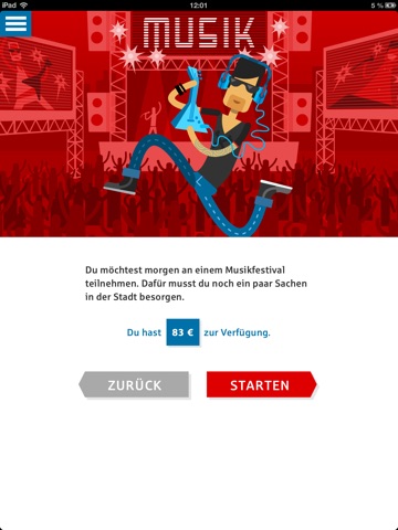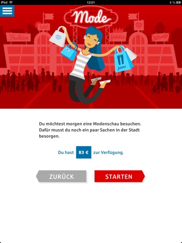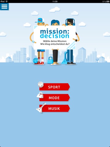 Entscheidungen prägen unseren Alltag. Sind unsere Entscheidungen aber auch sinnvoll und rational? Oder lassen wir uns durch die Tricks von Verkäufern beeinflussen? In der App kannst du dich zwischen drei Missionen entscheiden: Sport, Musik oder Mode. Dann machst du dich auf den Weg in die Stadt zu einer Einkaufstour. Unterwegs musst du ein halbes Dutzend Entscheidungen treffen. Zu jeder deiner Entscheidungen bekommst du sofort eine Einschätzung, die dir sagt, was zu deiner Entscheidung geführt hat. Am Ende weißt du, ob du dich eher mit dem Kopf oder aus dem Bauch heraus entscheidest.