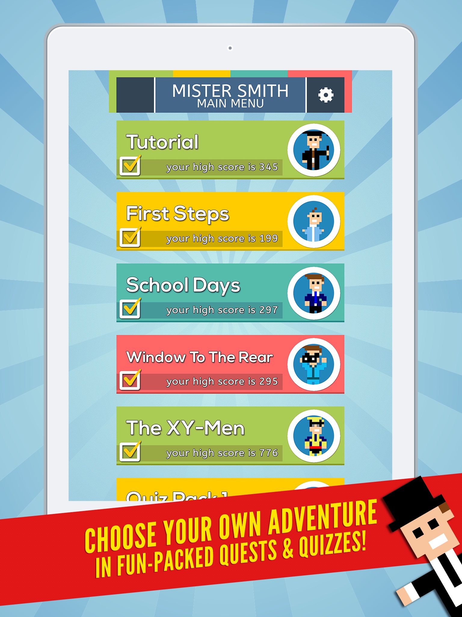 Make your way through interactive comedy plots in Mister Smith & His Adventures where you decide how the adventure ends. Be clever or dumb, kind or evil, logical or insane – the choices are yours and each outcome is unique! Which is more important: your phone or your date? Who would you save: yourself or your cat? What is the capital of France? Oh yes - as well as the storylines there are trivia quizzes! Everybody loves quizzes!