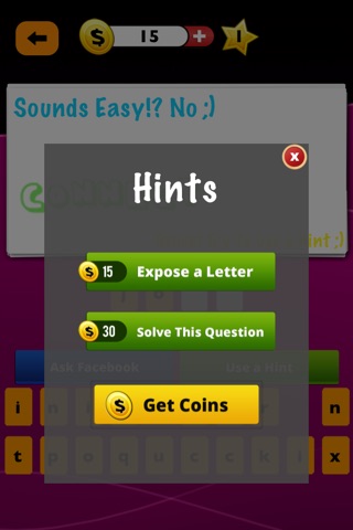 If you get stuck you have to tricks to make your life better. Get a hint by exposing letters or skipping questions!