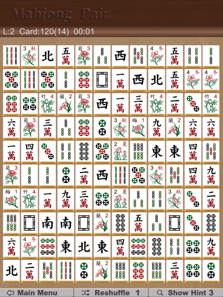 A very nice Find The Pair type game, using Mahjong tiles. The tile graphics are crisp and clear, and it is easy enough to tell them apart. There are a ton of tiles on the screen, in an 11 x 12 grid. The tiles seem to be just the right size to play the game. Not too big, and not too small. The game looks nice, and plays well on my older iPod Touch 2G.