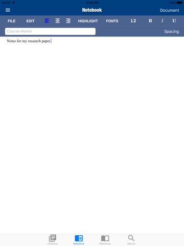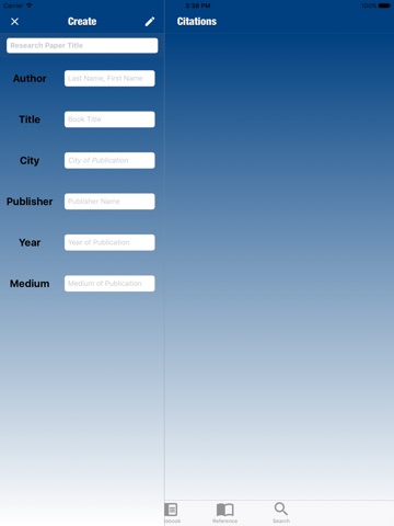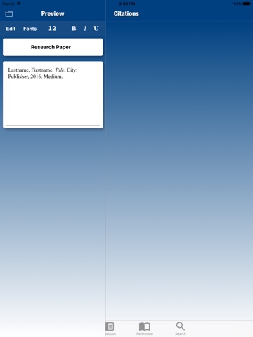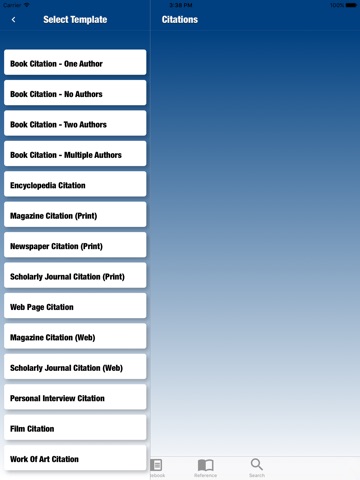 The Citations section of MLA Cited allows the user to select from 14 pre set templates most commonly used in an MLA research paper. Simply select the template you would like to use, enter your paper title at the top, and type the requested information in the open fields. When finished tap “Create” and it will bring back to the list of templates. When finished entering the templates you need select “Done” and you can review your list of citations.