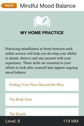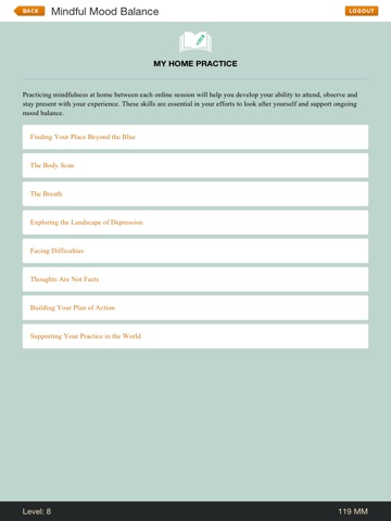 The MMBPro companion app gives mobile access to helpful notifications, expert answers to questions, home practice descriptions and downloads, and audio home practice files. This should be used as a helpful support tool to the online Mindful Mood Balance for Professionals program. A valid MMBPro login and password is required for access.