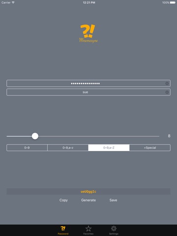 Whenever the admin needs to login into Sues or Johns account, he will enter his secret passphrase "my iphone rocks", the user name ("sue" or "john") and the "Length" and "Strength" values "8" and "0-9,a-Z" into Mnemosyne to reconstruct the password.