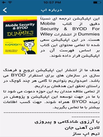 این اپلیکیشن ترجمه ای نسبتاً دقیق از کتاب Mobile Security & BYOD For Dummies از انتشارات Wiley هست. در این اپلیکیشن سعی شده تا تمامی محتوای این کتاب بر اساس فهرست آن در اپلیکیشن قرار داده شوند.