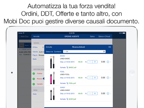 - Inserimento documenti: grazie alla configurazione di causali, è possibile inserire documenti di qualsiasi tipo (ORDINI, DDT, DOCUMENTI INTERNI)