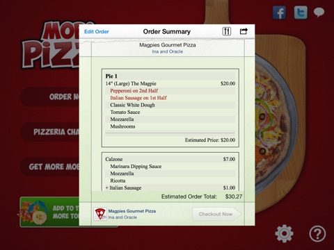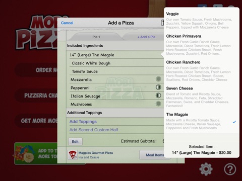 Turn on your iPad and be transported to a pizzeria kitchen. You are in control of the pizzeria and your imagination is the start to a great pizza making adventure! Choose your favorite dough and spread rich tomato sauce or an inviting pesto. Do you like cheese on your pizza? You can add as much cheese as you like from 5 different types! Mix and match 26 classic pizza toppings so real they make your taste buds tingle. Our brick oven does the baking for you. Slice the pizza into triangles, squares or not at all. Save a photo, share on Facebook or email your friends the pizza you are enjoying! An order form conveniently records all your selections for easy ordering from your favorite local pizzeria. Mobi Pizza is a customizable, interactive, and engaging game that is fun for all ages. Have a baked pizza that isn’t perfect for you? You can always navigate back to a previous screen and make adjusts so your pizza is the way you want it. Are you a vegetarian that doesnt want to see meat? Just select Yes for the Vegetarian Setting.
