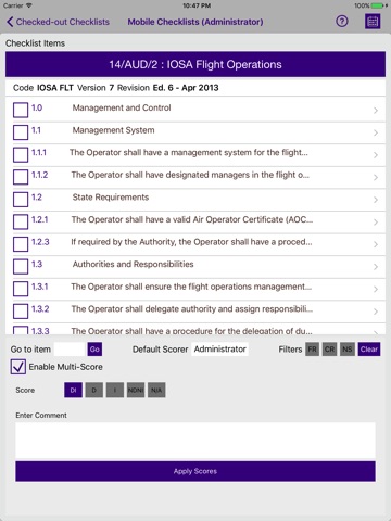 Based on the RR SMS Security Model, all Audits a user has access to are presented along with their Checklists. These can be checked-out and scored. As part of the Scoring Process, Guidance Material and Auditor Actions can be viewed, References can be read and added. In addition to that, Findings can be raised, as well as pictures taken as attachments.