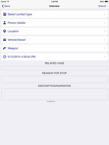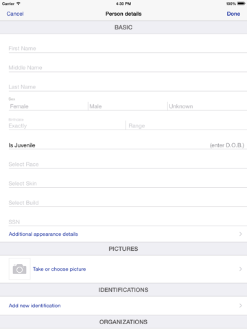 - Photographs. Take photographs directly within the app and link them to the person, vehicle, scars/marks/tattoos, or weapon.