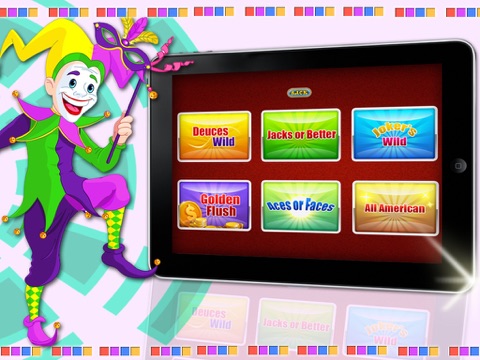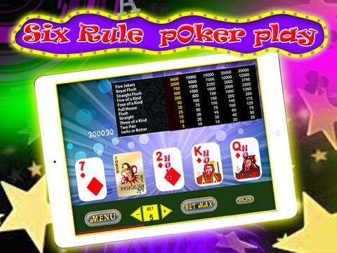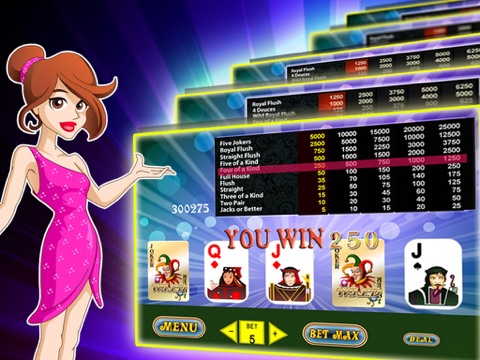 video Poker is a simulated casino poker game. A players goal is to obtain a poker hand from 5 randomly displayed cards. This game requires two deals to be considered a WIN. Credits are given on a WIN as per pay table. A player can hold the favorable cards of the first deal to make the strategy to win the game; cards can be held by selecting the card image or lock buttons.
