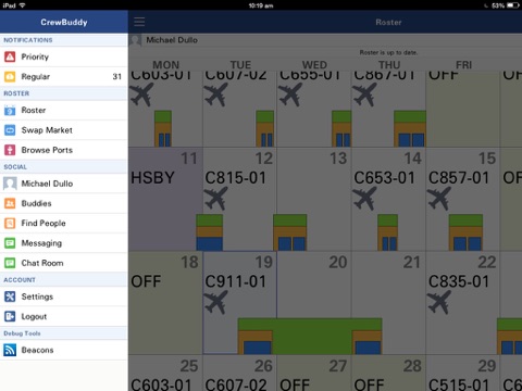 CrewBuddy is an application for pilots and cabin crew to view and automatically update rosters, swap roster shifts legally with similarly qualified users, receive and acknowledge important notifications from their airline, browse weather and airport details of ports they fly to and develop a social network with other users of the app.
