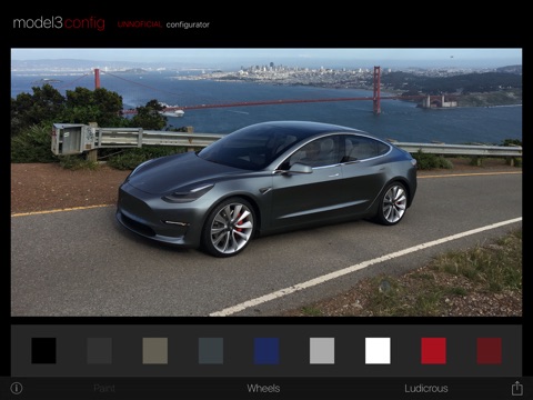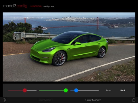 model3config is an UNOFFICIAL configurator for the Tesla Model 3. It allows you to see what the car could look like with different exterior color, wheel, and trim options. It starts with a selection of 9 familiar pre made colors but also allows you to customize your own color with RGB controls. Once youve built a configuration you like and want to share with friends, you can save the image to your devices Photo Library.