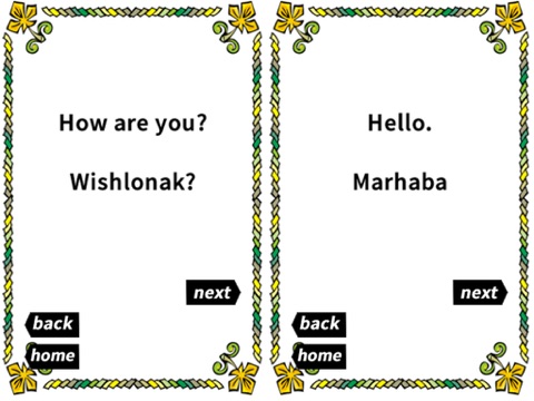 Simply touch each term or phrase to hear the term or phrase spoken in English and Modern Standard Arabic. The Modern Standard Arabic translation is repeated twice (the second time more slowly) to help students understand the pronunciation of each term or phrase.