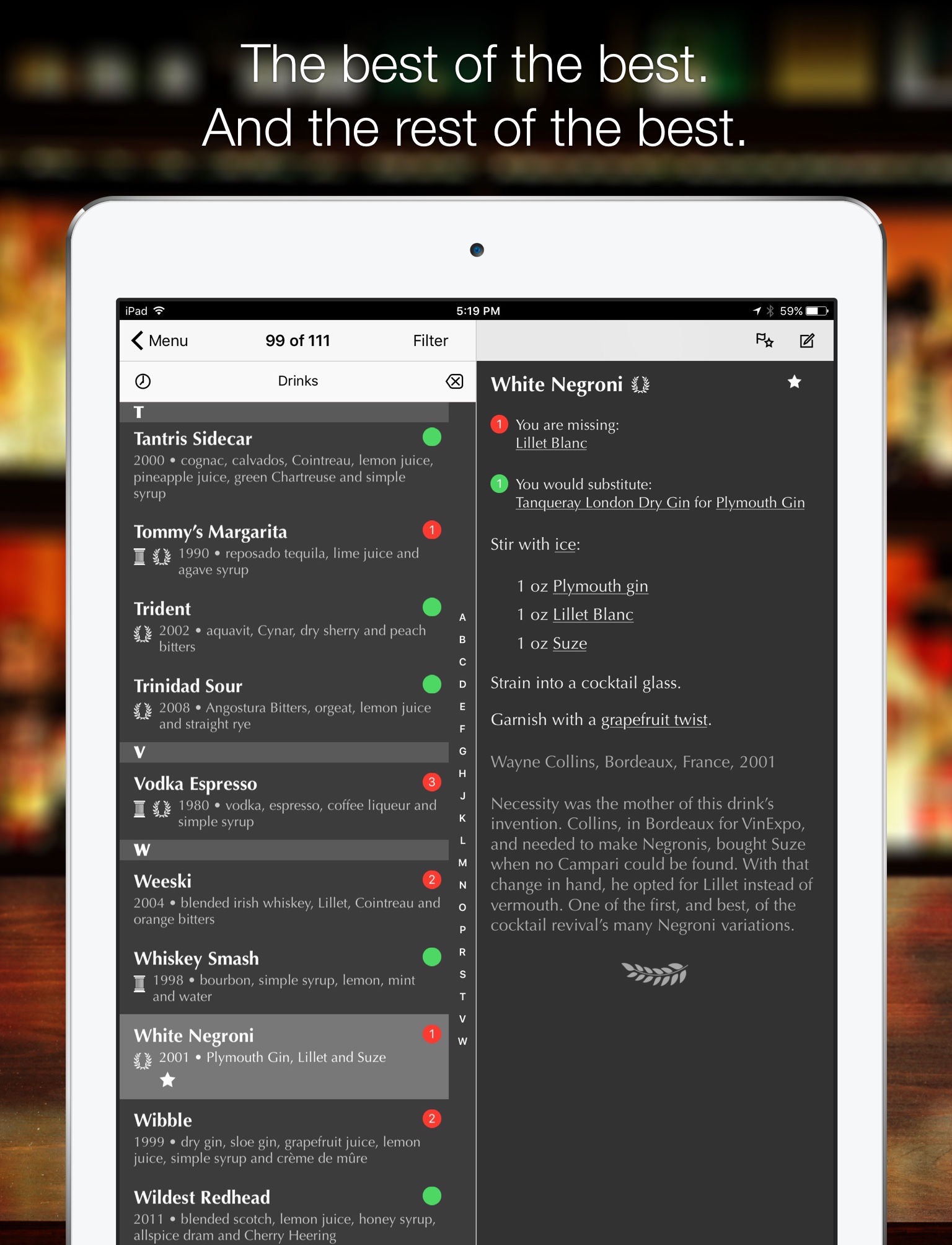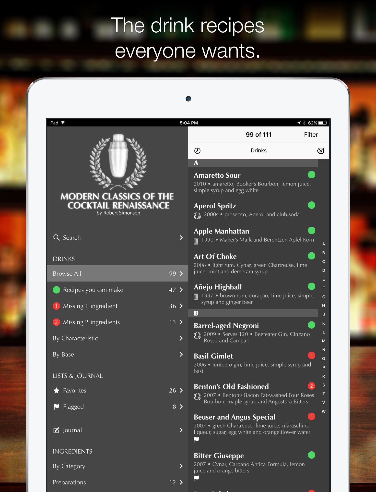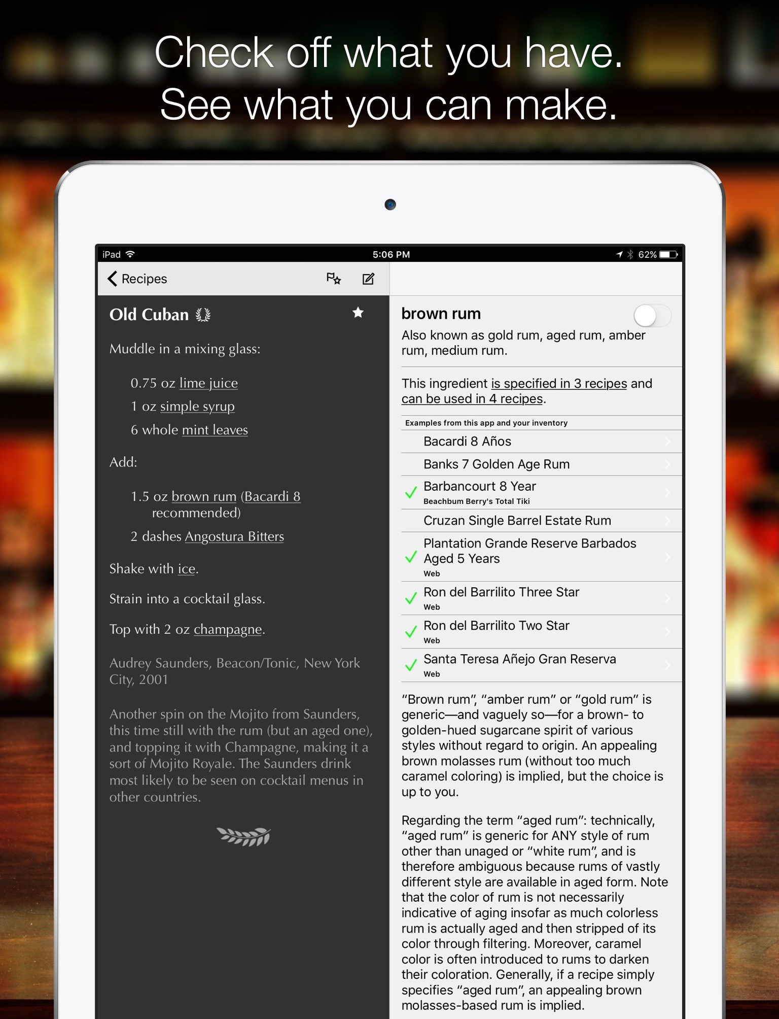 - Check off the ingredients you’ve got and this app will show you which drinks you can make