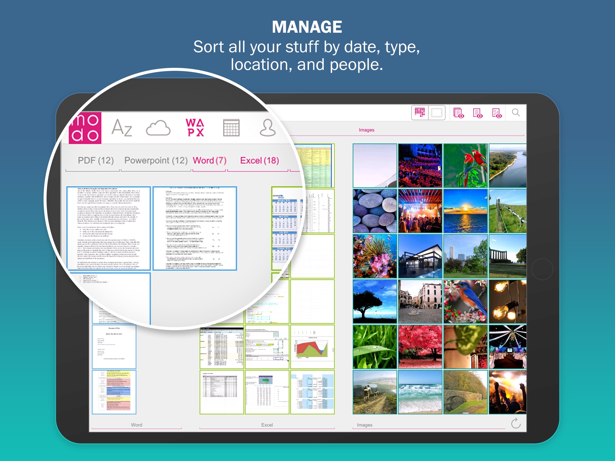 We all have digital stuff created over years of work and fun. modo gathers all your digitally-stored files scattered over different clouds and e-mail accounts, and gives you a visually detailed and stunning overview. Remember that frustrating experience of trying to remember when you sent or received a document or photo from someone... and you just can’t find it... Well, discover forgotten documents and photos buried somewhere in your e-mail or cloud fast. modo’s search options and filters quickly find important files, vouchers, photos, bills, especially when you are on the move or in a hurry and naturally cannot remember where you put them. Forget about forgetting.