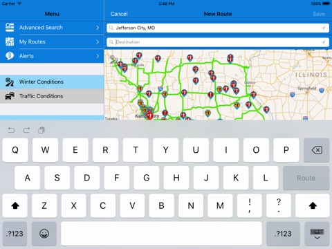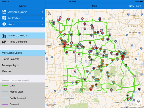 This app is next to useless on an Iphone. The road colors are only a few pixels wide no where near the width of the road or highway. So when a thin purple line is over laid on a yellow road it almost appears red. When zooming in the colored line showing the road condition does not resize to match the new size of the road.this could be a very useful app. Especially for users that cant use flash on their computers.