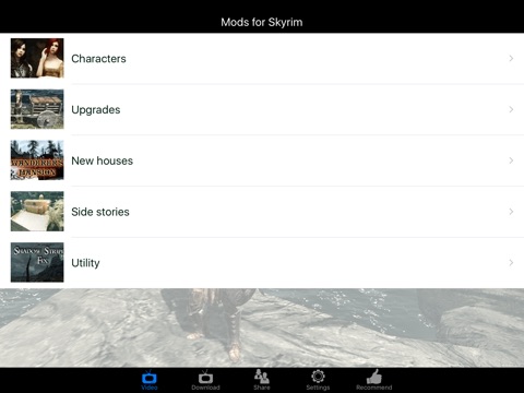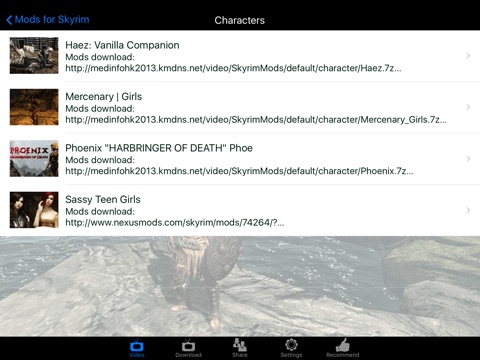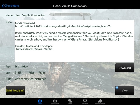 This app contains mods information for Skyrim and most of the mods can be downloaded from our server without further charge or periodic subscription. Moreover, videos of the mods in action are included, so that you can watch the videos and decide whether the time needed to backup the game, download and install the mods is worth.