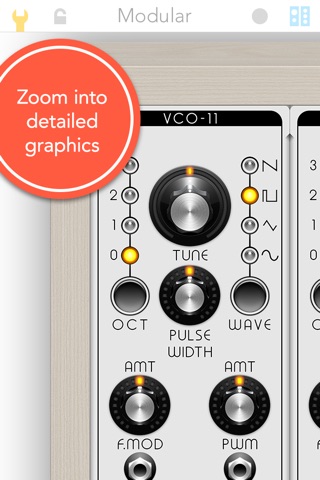 What makes modular special is the audio and visual experience you have with it. Beautifully minimal menu systems and interface along with ultra realistic synthesizer graphics are just the beginning. The real beauty is not what you see, but what you hear. Pristine and punchy oscillators that sound great, even at the extreme ends of the frequency spectrum. It starts with band limited oscillators. Not just traditional methods of band limiting, but band limiting that enables each note you play to have the maximum number of harmonics without distorting.