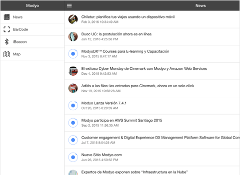 Modyo Mobile app is an internal app for testing new features and frameworks, Ionic framework 1.X and plugins, maps, QR scanner, iBeacon features.