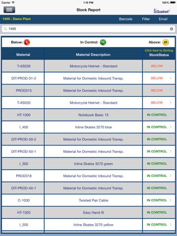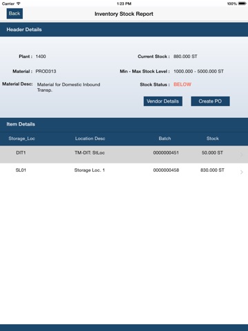 This Mobile App will support the process owners to view the online inventory stock with details at plant, material, storage location and batch wise with stock status as “Above”, “In-Control”, “Below” by comparing with Min & Max stock level maintained in the material master of ERP system (SAP). The App also has feature to scan QR code/Bar code to fetch input data for online Inventory Stock and also provision to create Purchase Order for selective vendor and also has the facility to send mail/Call to Vendor.