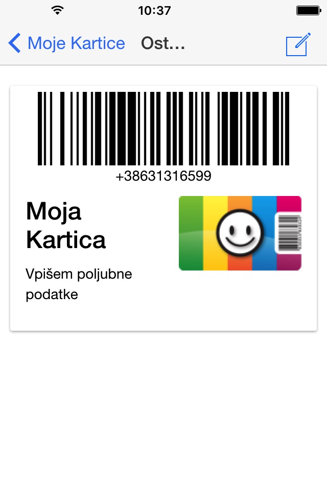 Seznam vnesenih kartic se izpiše na osnovnem zaslonu, po izbiri posamezne kartice, se prikaže črtna koda, s številko, imenom in grafičnim simbolom ponudnika.