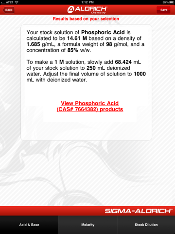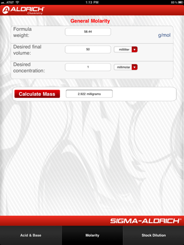 The Molarity App from Sigma-Aldrich(R) is a chemistry calculator tool that generates lab-ready directions describing how to prepare an acid or base solution of a specified molarity or normality from a concentrated acid or base solution. A second tab includes a general molarity function that calculates the mass of any reagent needed to prepare a given volume of solution of desired molarity. A third tab features a stock dilution function that calculates how to dilute a stock solution of any known molarity to your desired volume and molarity.