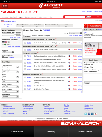 - The Acid and Base instructions link to Sigma-Aldrich website/mobile website to display relevant acid or base products.