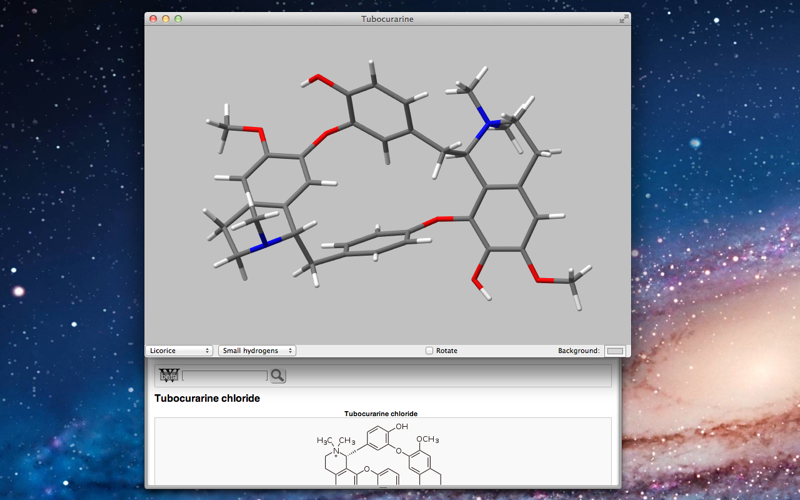 Built-in database of 250+ common molecules in all fields of science and everyday use, with a short description of the molecule. Reads your own files (or those you download from the web) in popular 3D molecular file formats (PDB, MOL, SDF, XYZ and CML).