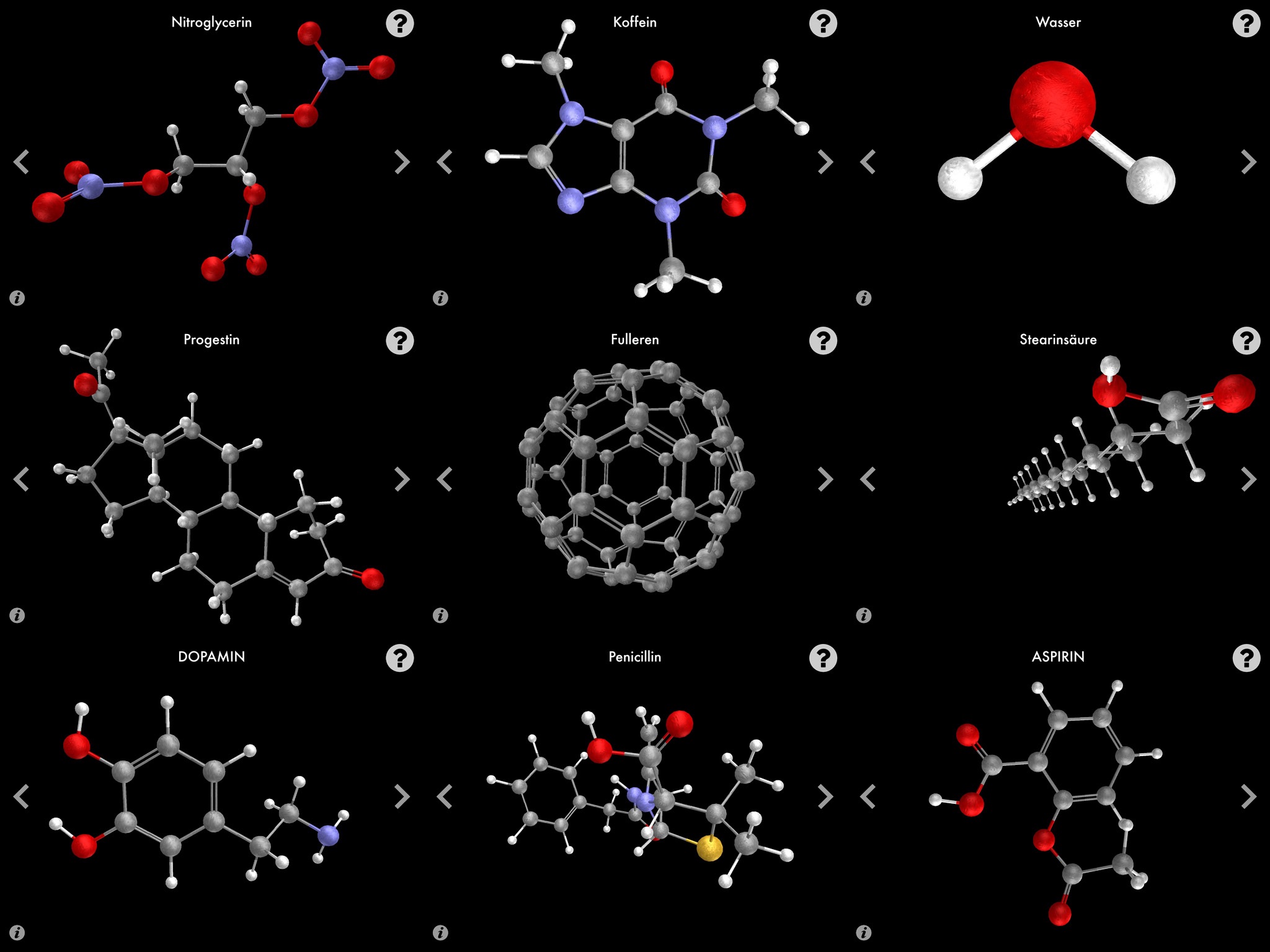This app is a translation of the interactive 3D installation "Molecules that Changed the World" by Ljiljana Fruk and Bernd Lintermann, which was designed at ZKM/Institute for Visual Media to accompany the "Molecular Aesthetics" Symposium held at ZKM | Centre for Art and Media, Karlsruhe, Germany in 2011.