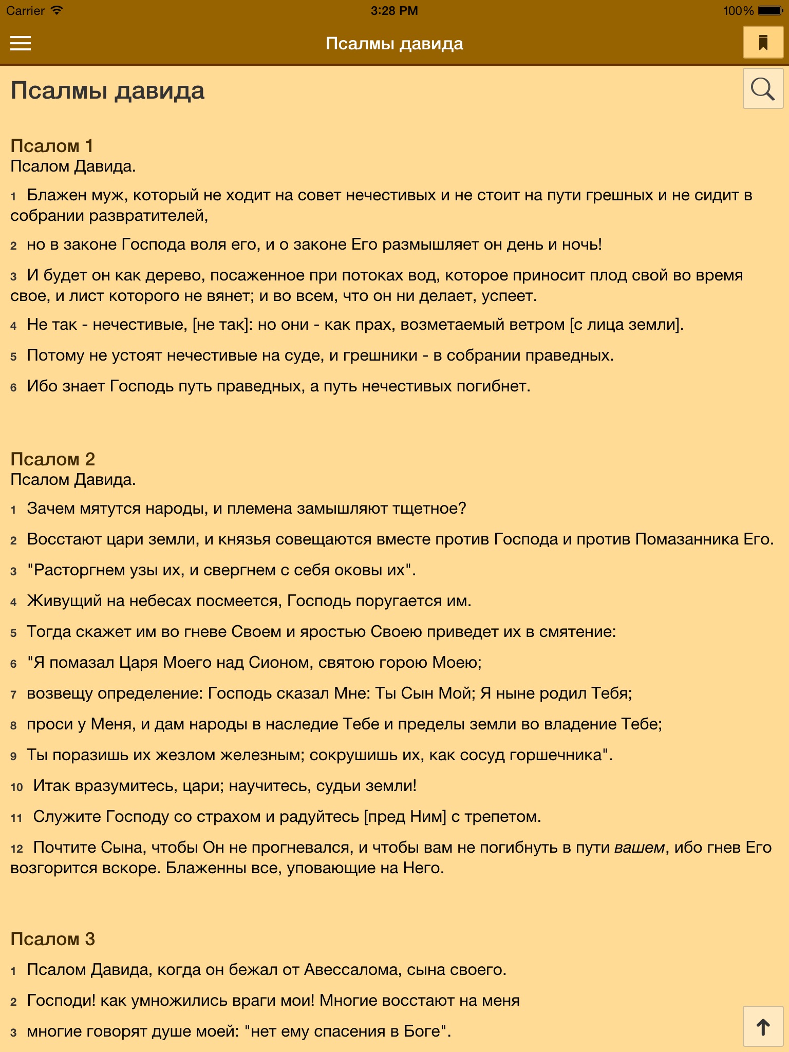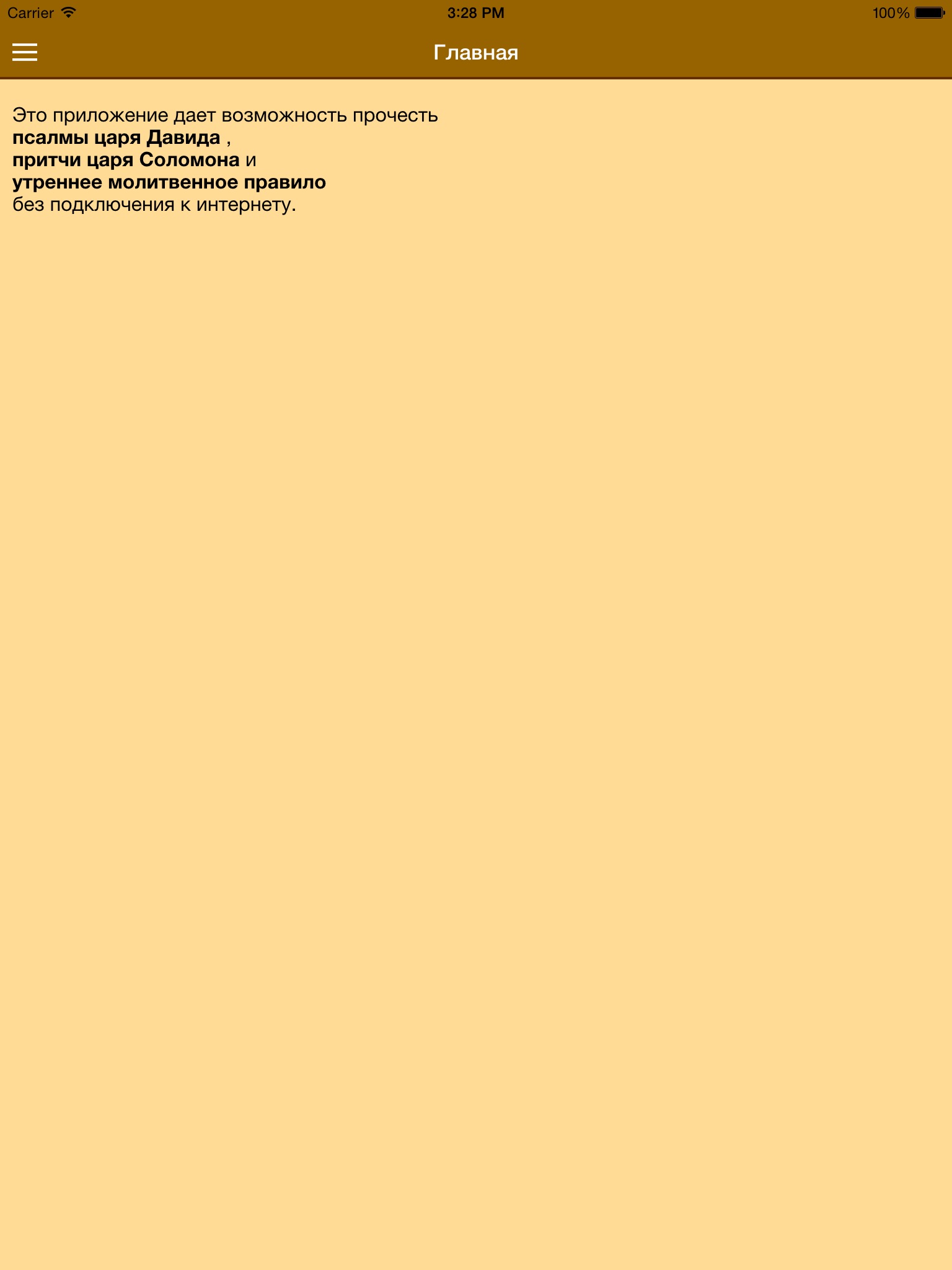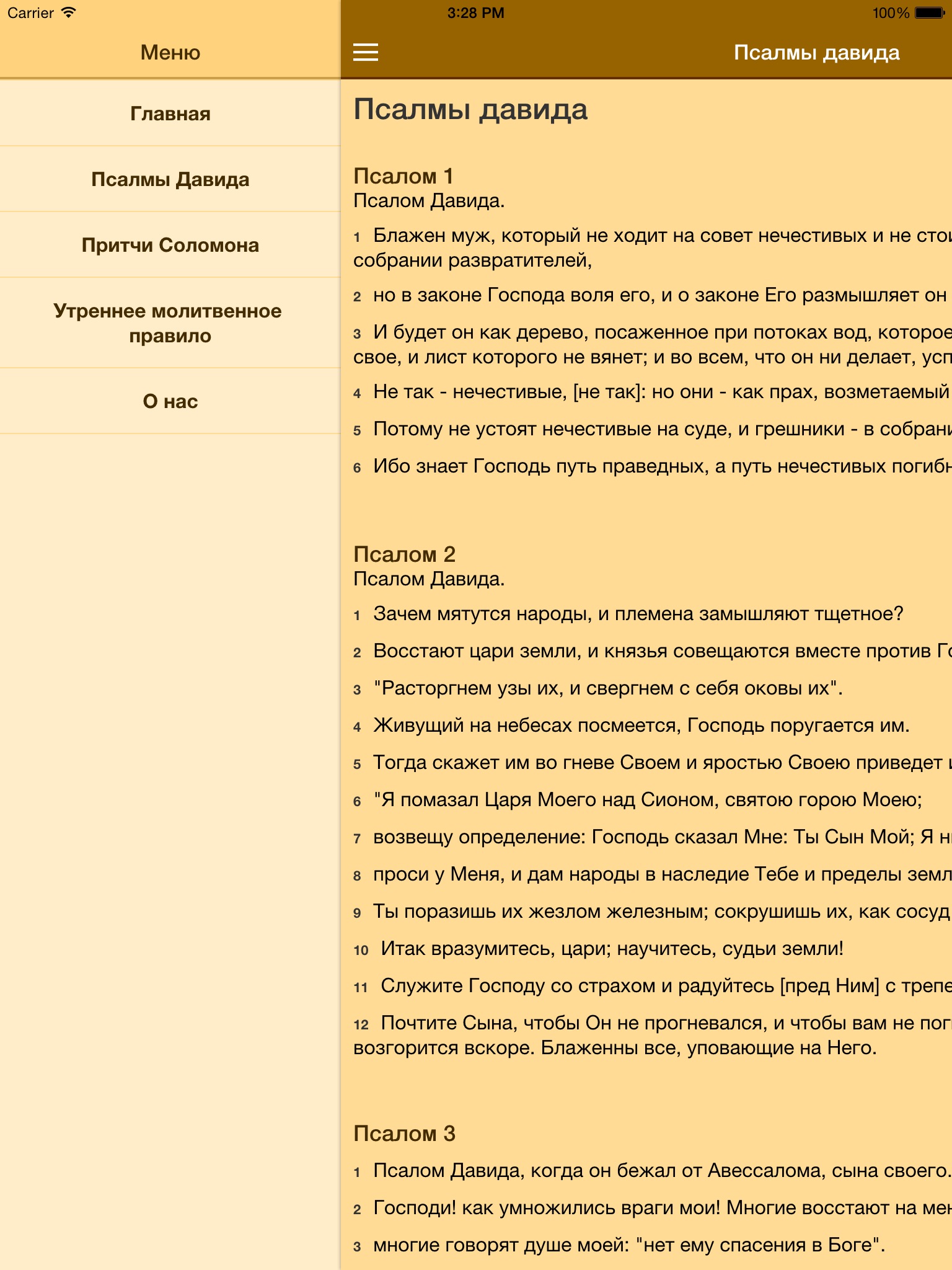 Приложение дает возможность прочесть утреннее молитвенное правило, притчи царя Соломона и псалмы царя Давида. Запуск оффлайн режима, без рекламы.