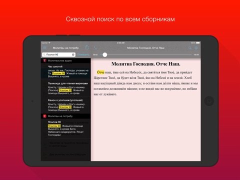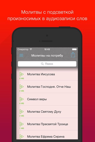 Подсветка произносимых в аудиозаписи слов позволяет следить за текстом, помогает лучше понимать и запоминать молитвы.