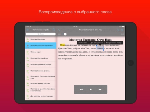 ・Воспроизведение с выбранного слова при помощи долгого касания;