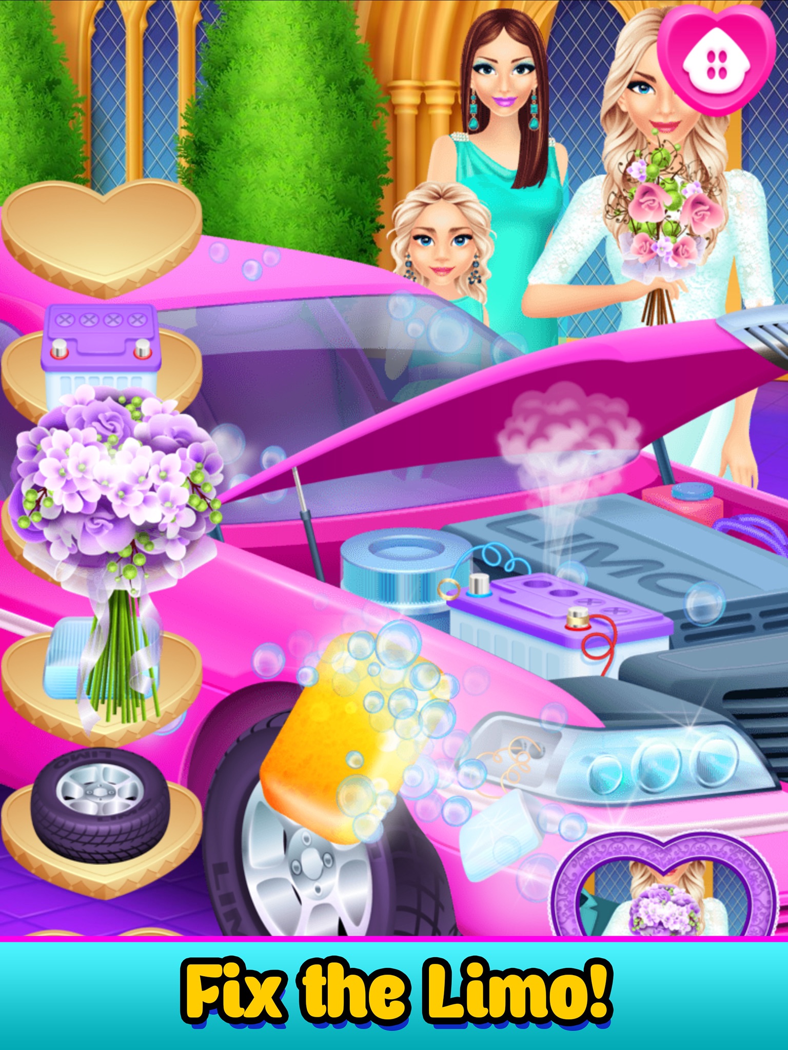 Level 3: Oh no! Limo broke! Help fix the limousine by changing the tire, cleaning and putting in the car battery.