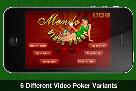 Mondo Video Poker is a video poker game like no other, giving you great variety of games at a low price! Mondo Video Poker gives you six different video poker variants. Mondo Video Poker also gives you lifelike animations, authentic vegas sounds, and great odds! Plus you can see how well you are doing with our Game Center leader board! Download Mondo Video Poker today and start playing these fun video poker games: