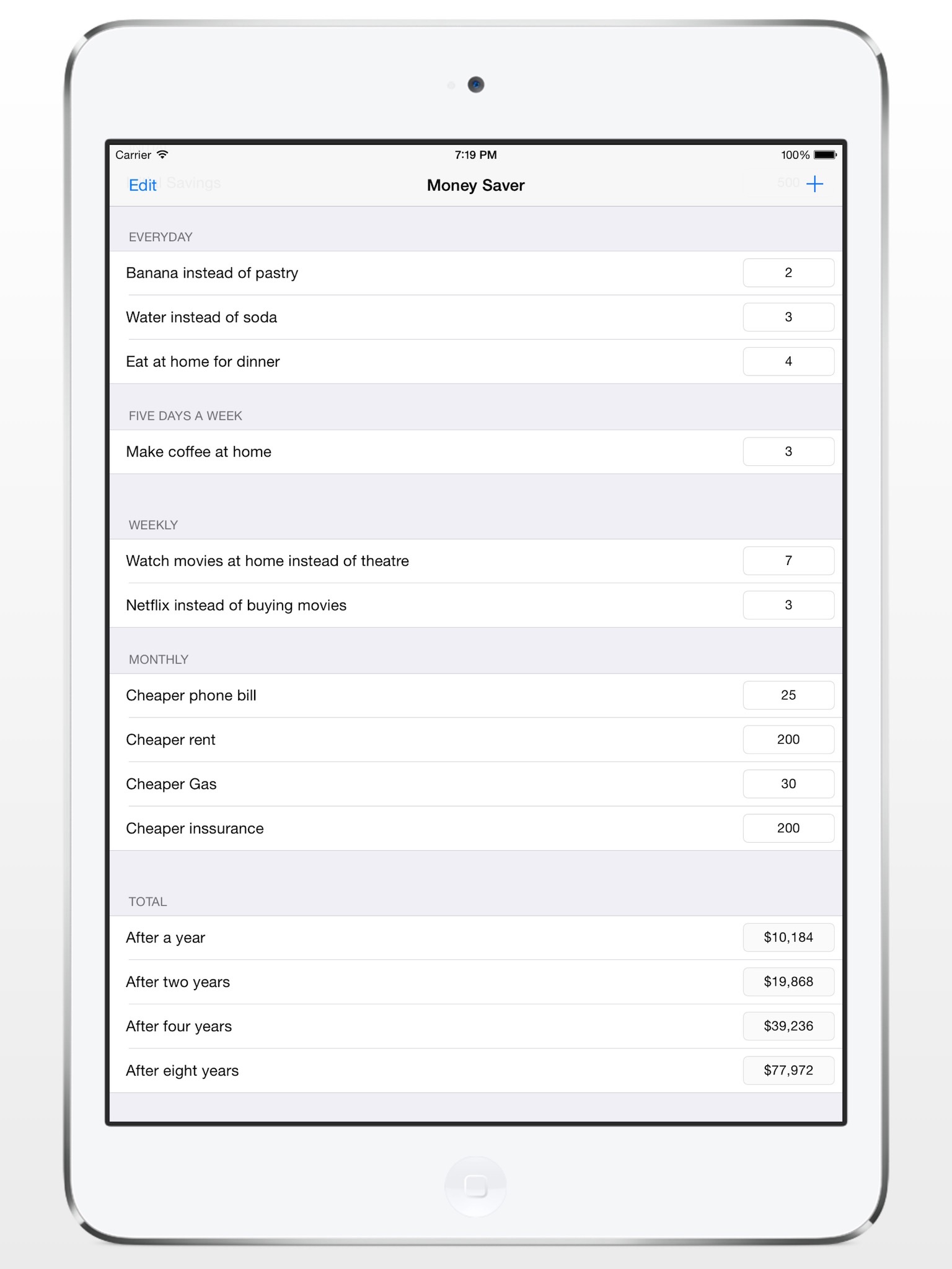 Calculate savings with ease! Money Saver will help you calculate savings for years in advance. It will also save all your savings and let you add more in the future.
