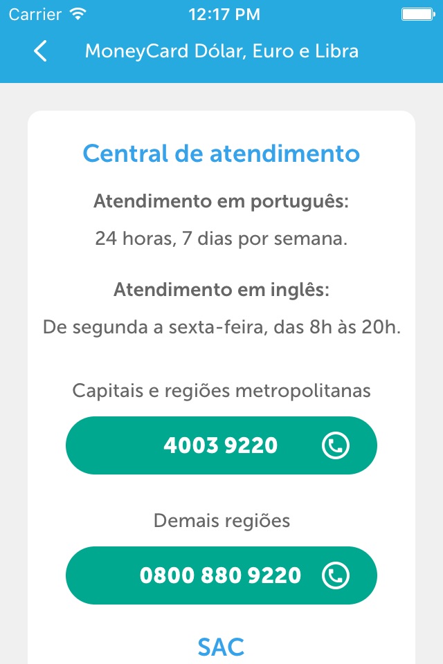 - Disponibilizar os telefones de contato da Central de Atendimento ao cliente, com atendimento personalizado sobre o Moneycard.