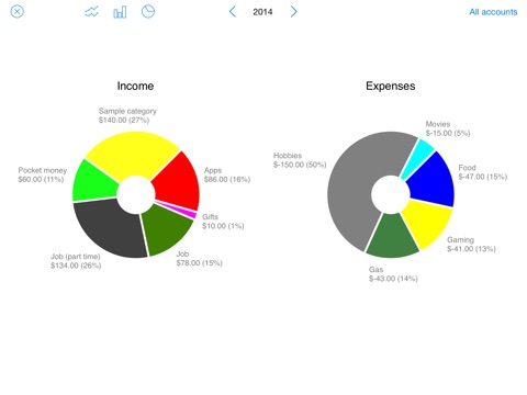 - Pie charts with the income and expenses per category