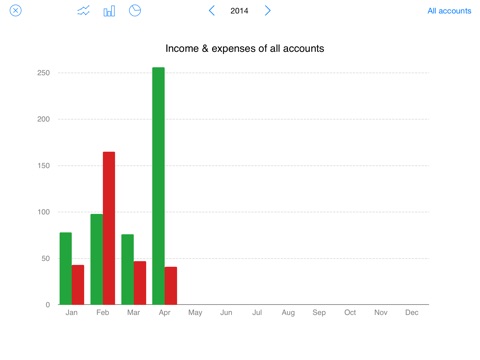 To visualize your income and expenses Moneyfiles will plot for each account separately or for all accounts together
