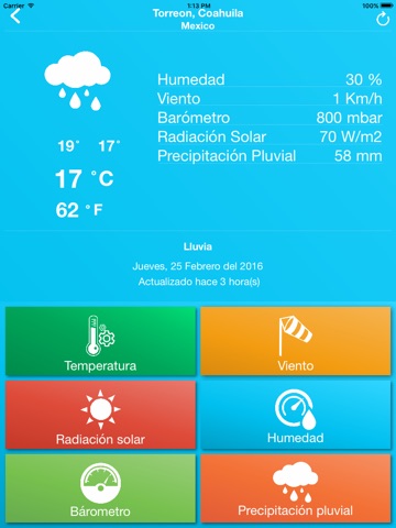 Consulta la temperatura, nivel de radiación,probabilidad de precipitación,humedad, muestra la presión, velocidad del viento y dirección actual, diaria o en las ultimas horas y gráfica los resultados.