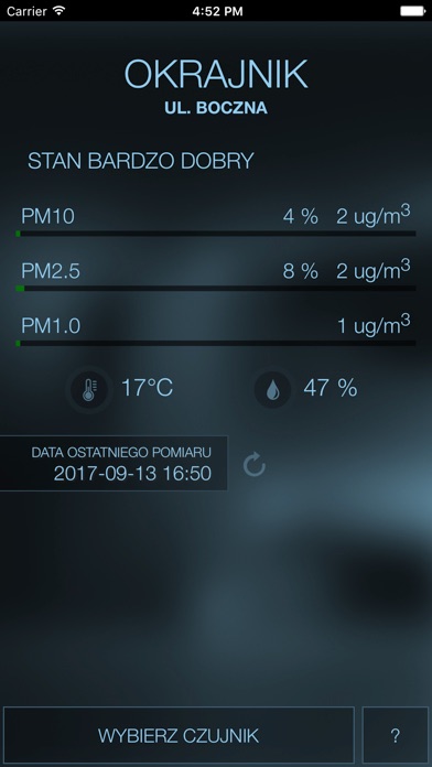 Podstawową funkcją aplikacji jest wyświetlanie aktualnego stanu powietrza dla takich substancji jak: pył zawieszony PM10, PM2.5, PM1.0 oraz wilgotność i temperatura.