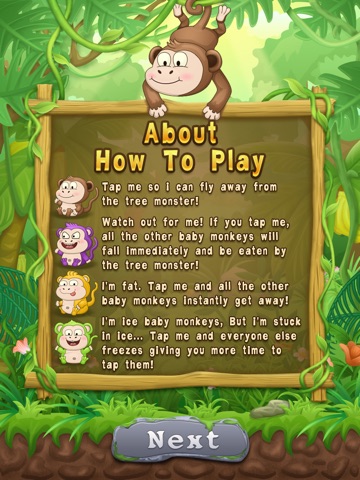 Stop the baby monkeys before they fall into the grouchy Tree Monsters Mouth. As they fall faster and faster tap the baby monkeys to save them from their fate.