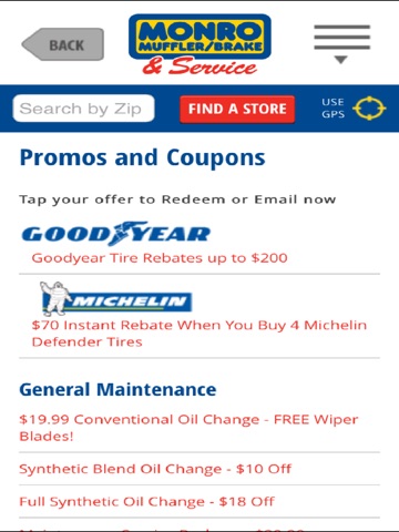 SAVE MONEY: View and redeem coupons for auto services and tires, including manufacturer rebates.