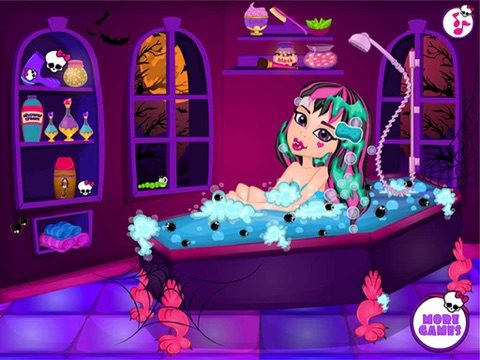 You have to be there as Draculaura personal beautician, makeup artist and fashion designer! Follow Draculaura and help her do the ritual. A spa bath with beauty masks, moisturizing soap. Create an unique makeup, choose a hairstyle, a dress, awesome shoes and creepy accessories and she will shock everyone with her charm!