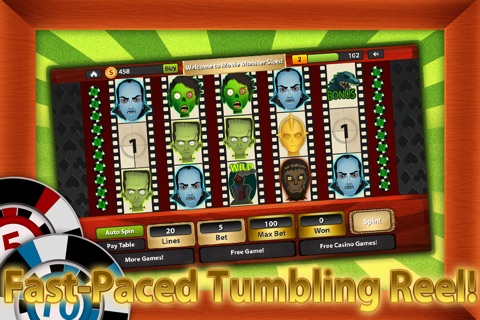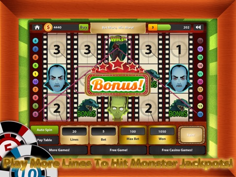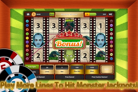 Monster Jackpots is a fun to play FREE multiline and level 5-reel slot machine game. Start with 3,000 coins and 20 betting lines to work your way through the 10 locked colorful game theme levels. Advance to the 30 line betting games with frequent bonus spins and games to help you get there. Spin the wheel now and bet up to 1000 coins for some wild Vegas casino style action! Stay up all night to get lucky with this great game.