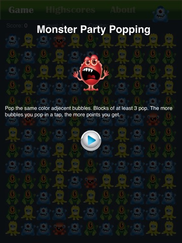 Monster Party Popping puzzle Game is a beautiful designed, bubble burst game featuring fast paced, addictive and exciting bubble popping action. Monster Party Popping puzzle Game is an amazing and very absorbing classic game where you must select 3 same color of bubbles on a grid and tap to destroy them. Bubble Popping King Saga is a simple but beautiful bubble popping puzzle game optimized for the iPhone,iPod and iPad. Pop the same color adjecent bubbles by tapping on them. Tap the bubbles that are adjacent to other bubbles of the same color. Score points by getting the most adjacent bubbles in a row. Play forever. Virtually endless fun with infinite levels.
