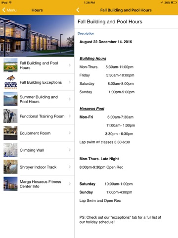 Stay connected to the Marga Hosaeus Fitness Center on the Montana State University campus in Bozeman. Find building and pool hours plus the daily schedule of classes, intramurals, and events. Get instant notification of closures and cancellations and all the info you need to make court reservations, schedule massages and personal training, and join intramurals.