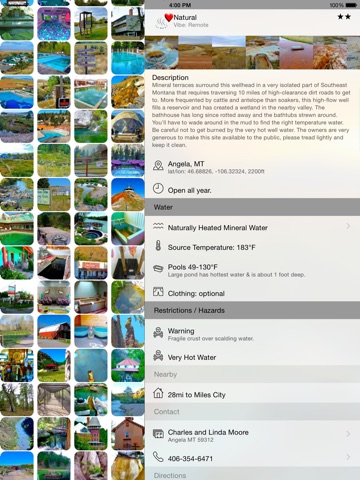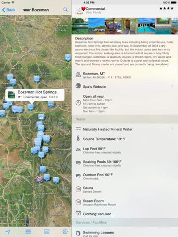 Find hot springs and spas using this electronic guidebook. With a focus on naturally heated mineral water, this guide will lead you to road-side soaks, spiritual retreats, commercial spas and natural springs in the deep wilderness. For the adventurous types, weve also included hundreds of unreviewed thermal sites from government databases and other sources. Unlike a static book, this guide has links to hundreds of color pictures, review sites, videos and nearby attractions. By including map-based navigation, GPS-based distance and heading, as well as written directions, it is usable on and off-line and with or without a GPS.