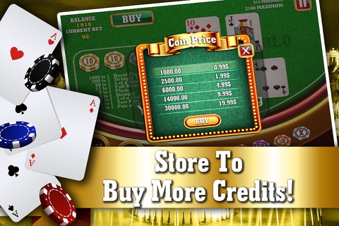 Enjoy the chic of the worlds most prestigious casinos right from your iPhone or iPad. Simple enough for anyone to pick up and play. Enjoy 5 card poker where the player is dealt 3 cards while the dealer holds 2 community cards face down on the table. The player then has the opportunity to reduce there wager before each of the dealers cards is revealed. The players payout is then based on the five card combination.